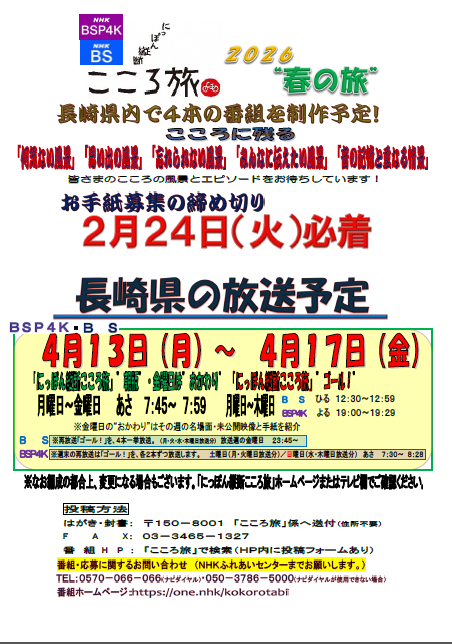 NHK『にっぽん縦断こころ旅 ~2026春の旅~ 』あなたの思い出の場所&エピソード募集中!
